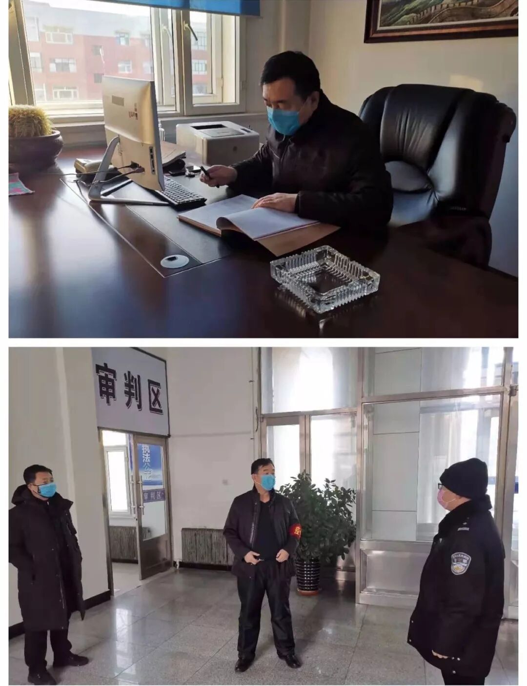 昔日法庭上维护公平正义的干警,如今变身成了驻守门前防控疫情的战士,他们放下了庄严的法槌,担起了防控疫情的使命,不同的驻守,同样的担当。