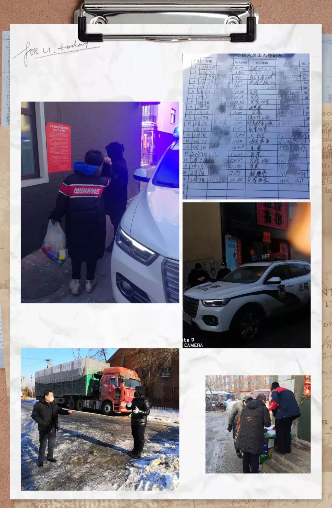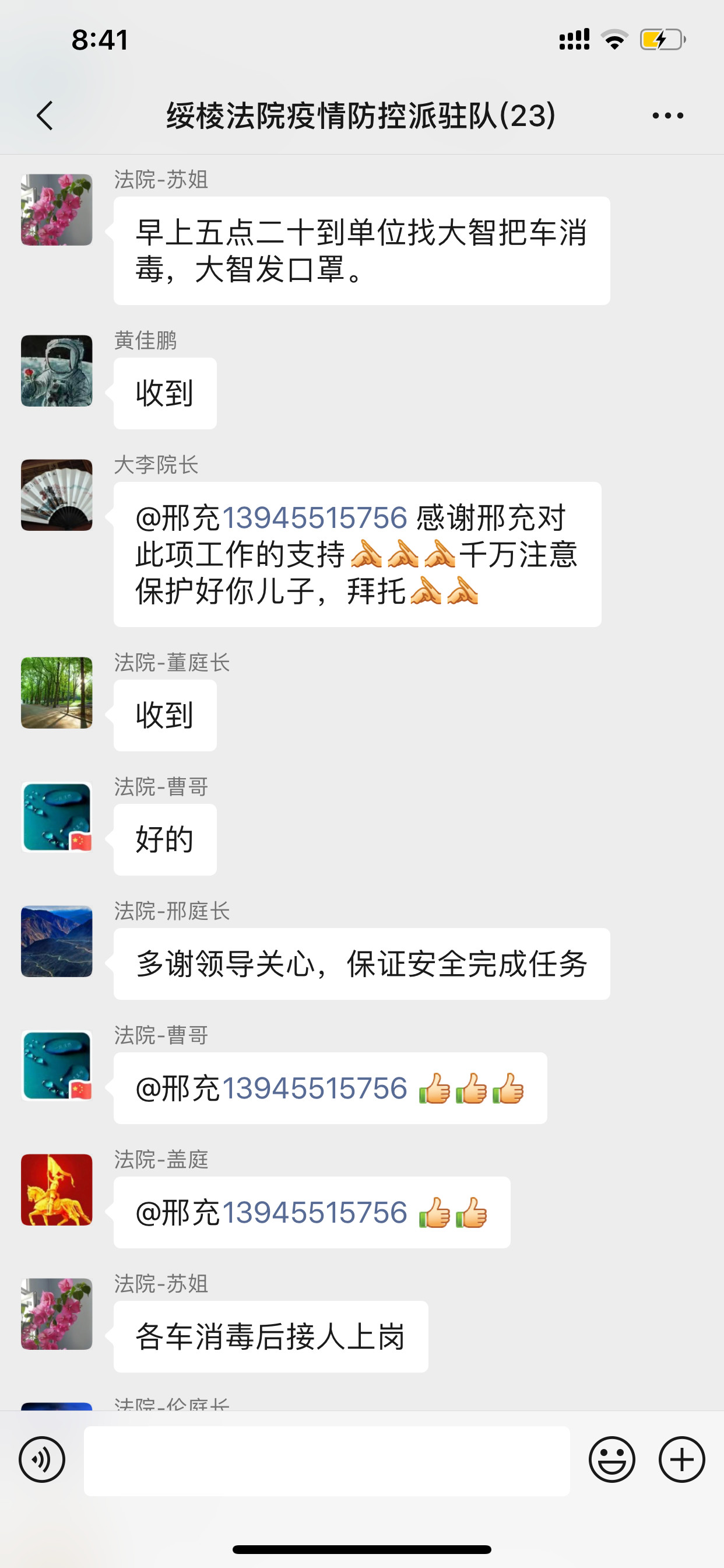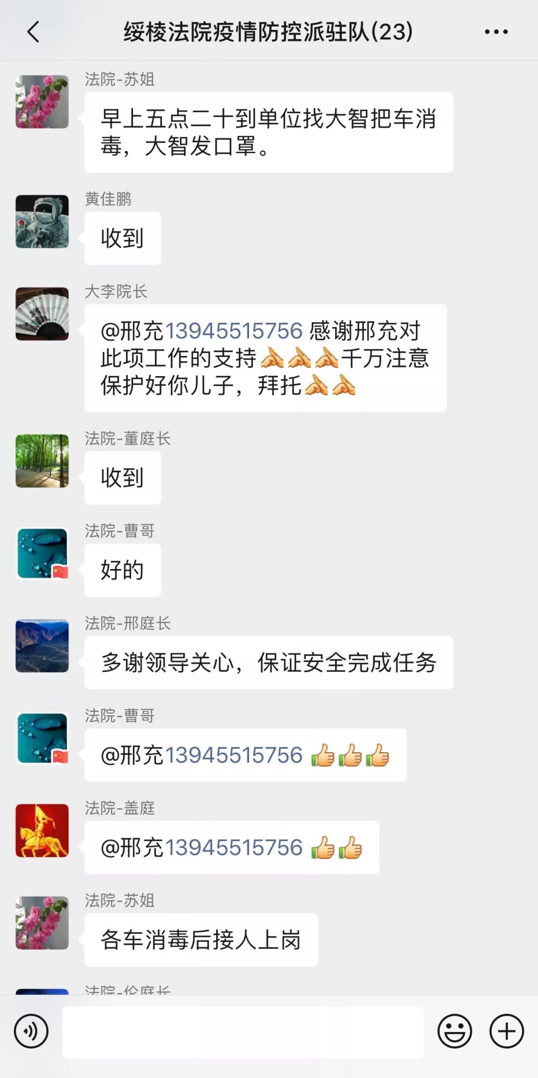 “你在疫情一线防控,我愿与你并肩作战” 。阁山法庭庭长邢充的儿子主动请战,要与奋斗在一线的父亲携手并肩,守护在弃管小区,守卫群众安全,他们是亲人,亦是战友,他们的举动感动了小区物业人员,激励着其他奋斗在一线的绥棱法院人。